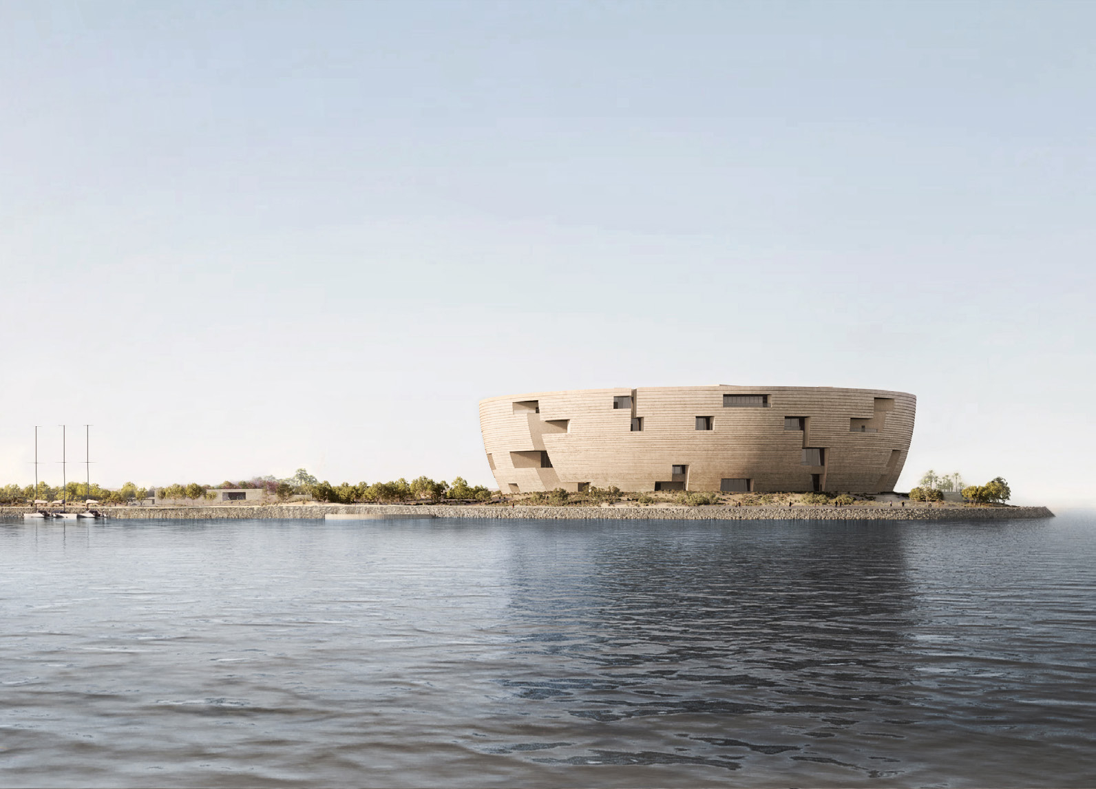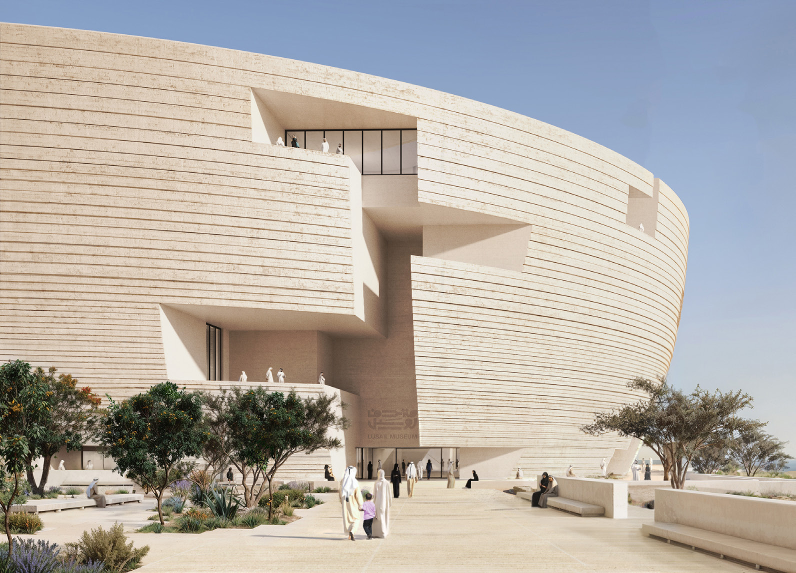 The precise geometric form of the building is both specific and universal — a truncated sphere, seemingly partially buried in the earth. The building exterior is rough, earthen, sand-like and resilient, in response to its coastal setting; it appears as if it is a piece of the land itself. Daylight enters the interior spaces through deeply recessed windows cut out of the facade, protecting the interiors from direct sunlight; the surrounding sea and city of Lusail remain constantly visible.