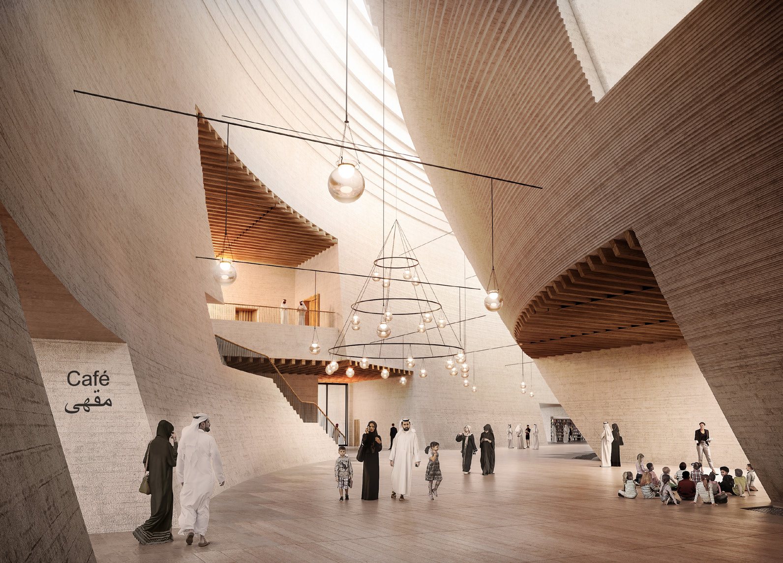 Three intersecting spheres shape and carve the volume of the building into two distinct parts: the first resembles a full moon, while the second resembles a crescent moon that is offset from its full counterpart. The space between these two forms is a crescent-shaped internal street naturally lit from above; it serves to connect the entrances of the museum to the central lobby and other public functions such as a library, auditorium, shop, café, and prayer space.