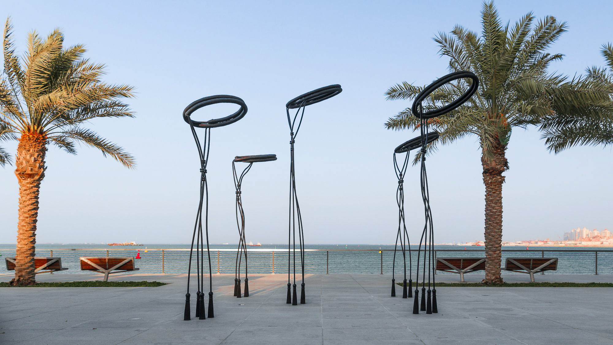 Unveiled at Lusail Marina Promenade in 2023, Al Mana’s Egal serves as a tribute to Qatar’s history and traditions, representing the cultural headwear worn by Qatari men. The egal is the black cord worn on top of the ghitra, a square scarf, as part of the national attire. The raised stance of the egals in this installation is a symbol of respect for Qatar’s leadership, citizens and residents for their unity during the blockade that began on 5 June 2017, while the artist highlights the different generations that experienced the blockade through the varying heights of each egal. The installation reflects Al Mana’s interest in merging elements from the past and the present, transforming a traditional cultural object into a contemporary emblem of resilience and pride.